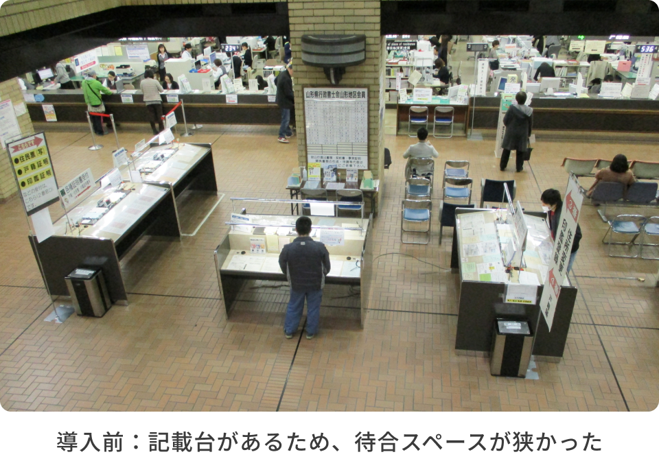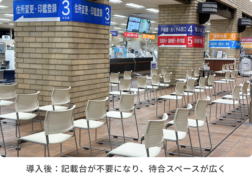 杉本様:やはり(流れが)すっきりしますよね。また、記載台って結構大きいんですよ。市民課前だけでも1台に6~8人ぐらいの人が使えるスペースのものが6台ありました。その分が、物理的に無くなって、そこに待合の椅子を置けるようになりました。椅子を置いたとしても、今までよりはかなりすっきりした印象になりましたね。