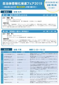 トップページ > 新着情報 > 登録無料!2019年6月5日「自治体情報化推進フェア2019 ~自治体における「働き方改革」の取り組み方~」を開催! > 自治体情報化推進フェア(チラシ) 新着情報 自治体情報化推進フェア(チラシ) ページトップへ戻る