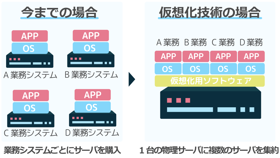 仮想化技術とは1台の物理サーバ上に、複数の異なるサーバを集約して稼働させる技術です。弊社では仮想化技術を利用し論理分割して各サーバを稼働させています。