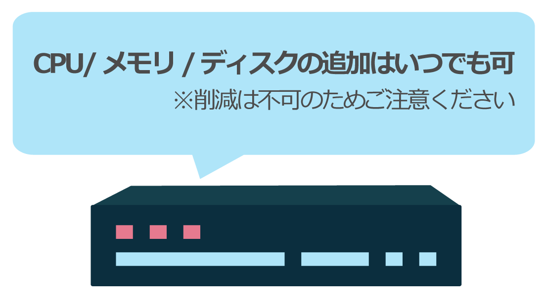 システム稼働に必要な最小スペックからのスモールスタートで運用が開始でき、業務の拡大に合わせて順次リソースを追加。サーバリソース(CPU・メモリ・ディスク)は随時追加が可能であり、運用コストの低減にもつながります。