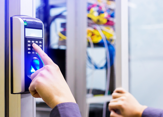 入退室には有人による対面受付および、ICカード+生体認証による厳重な管理を行っています。