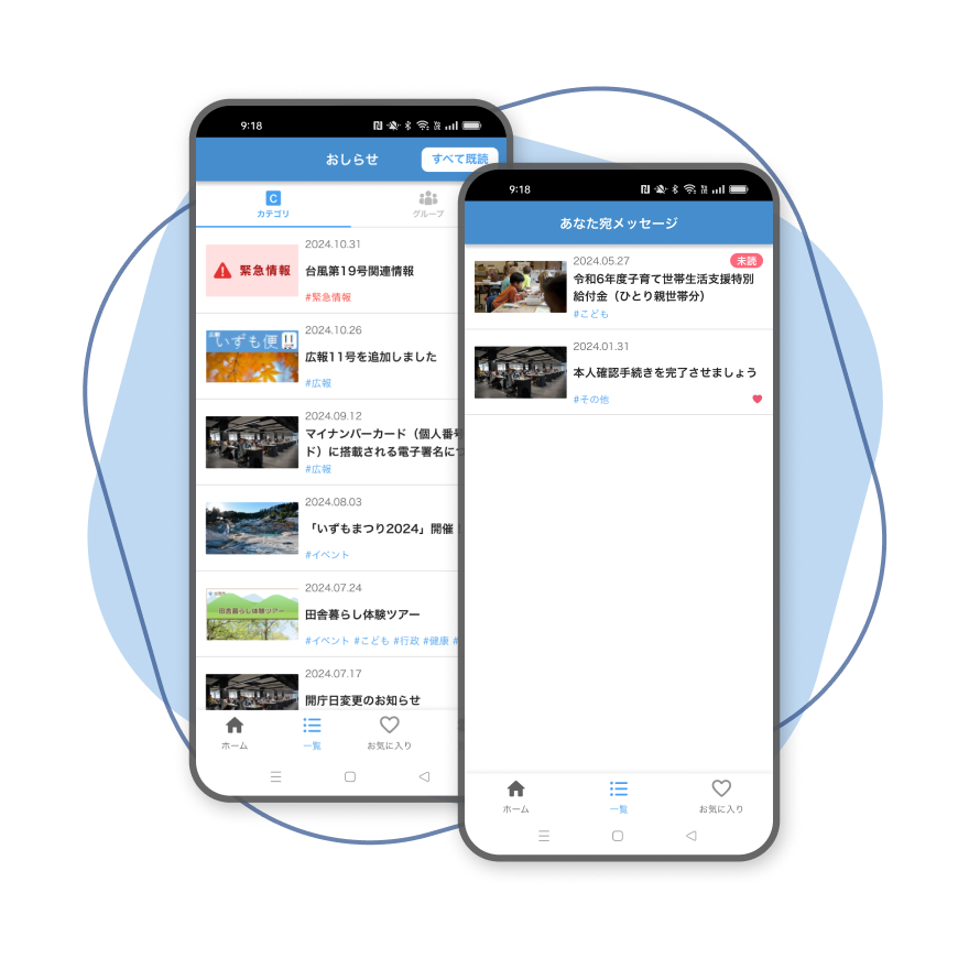自治体ホームページに掲載する記事や災害時の緊急情報、広報誌、各種行政サービス案内などを、スマホにプッシュ通知。住民は必要な情報を逃さず確認できます。